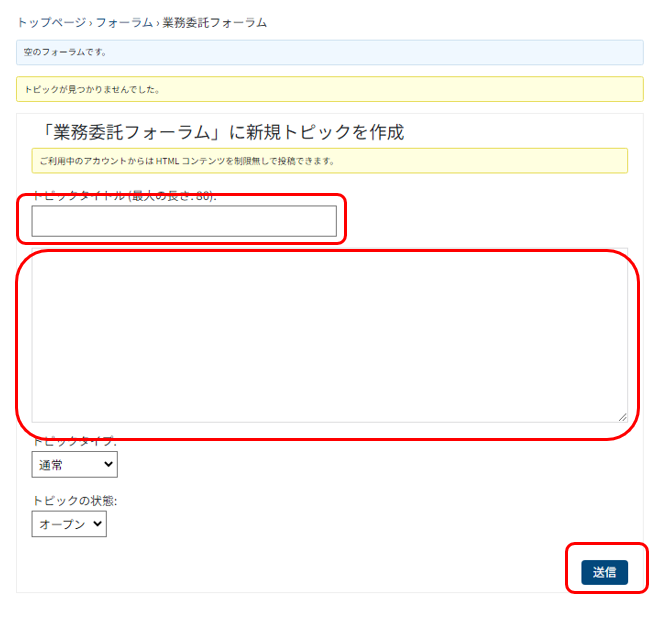 トピックのタイトルとトピックを入力し「送信」ボタンクリックで新しいトピックが作成されます。