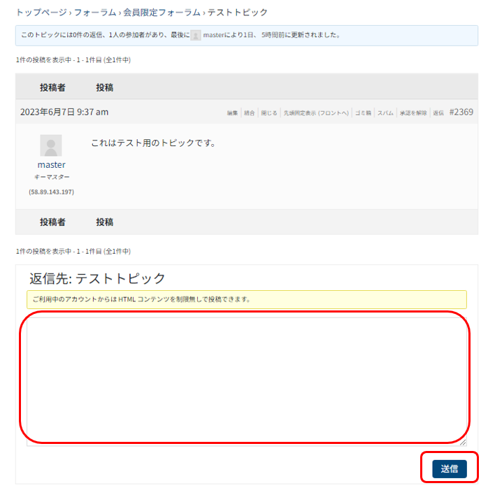 投稿したいトピックをクリックし、投稿欄に入力後「送信」ボタンクリックでトピックへ投稿されます。